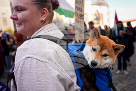Yuko the dog rides in her owner's backpack as people take part in a protest aiming to raise awareness of the violence and prejudice against women in Romanian society, in Bucharest, Romania, Sunday, Oct. 19, 2025. (AP Photo/Andreea Alexandru)