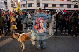 People take part in a protest aiming to raise awareness of the violence and prejudice against women in Romanian society, in Bucharest, Romania, Sunday, Oct. 19, 2025. (AP Photo/Andreea Alexandru)