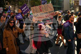 People take part in a protest aiming to raise awareness to the violence and prejudice against women in Romanian society in Bucharest, Romania, Sunday, Oct. 19, 2025. (AP Photo/Andreea Alexandru)