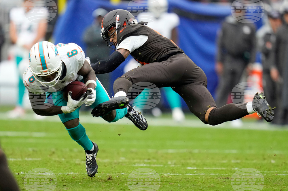 Miami Dolphins wide receiver Malik Washington (6) is hit by Cleveland Browns safety Rayshawn Jenkins in the second half of an NFL football game in Cleveland, Sunday, Oct. 19, 2025. (AP Photo/Sue Ogrocki)