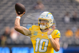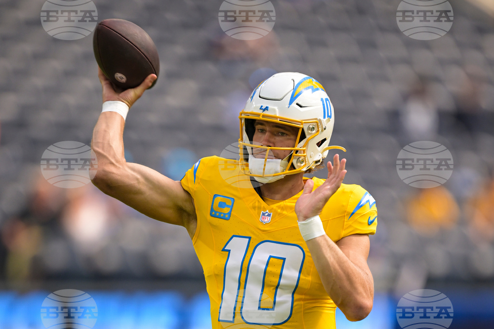 Los Angeles Chargers quarterback Justin Herbert (10) throws before an NFL football game against the Indianapolis Colts Sunday, Oct. 19, 2025, in Inglewood, Calif. (AP Photo/Carrie Giordano)