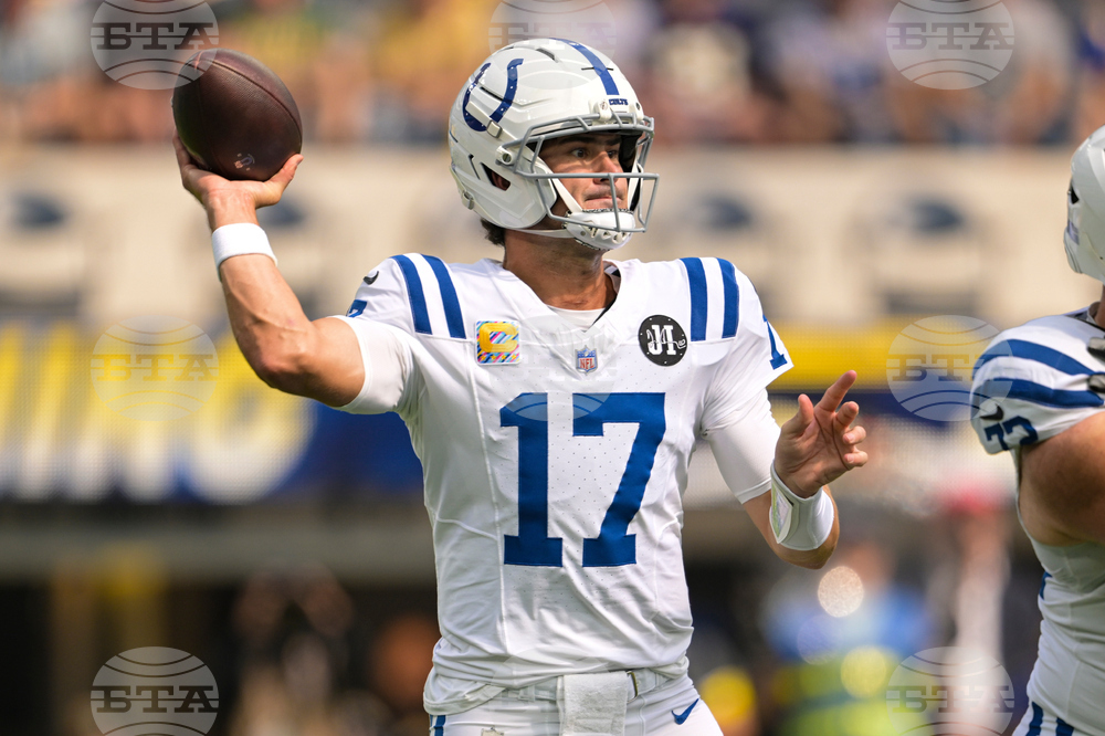Indianapolis Colts quarterback Daniel Jones (17) throws before an NFL football game against the Los Angeles Chargers Sunday, Oct. 19, 2025, in Inglewood, Calif. (AP Photo/Gregory Bull)