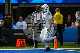 Indianapolis Colts running back Jonathan Taylor (28) runs for a touchdown against the Los Angeles Chargers during the second half of an NFL football game Sunday, Oct. 19, 2025, in Inglewood, Calif. (AP Photo/Carrie Giordano)