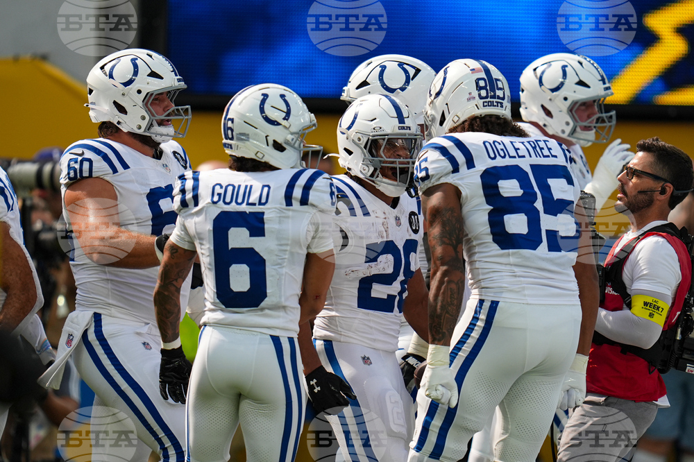 Indianapolis Colts running back Ameer Abdullah (26) celebrates after a first down against the Los Angeles Chargers during the first half of an NFL football game Sunday, Oct. 19, 2025, in Inglewood, Calif. (AP Photo/Gregory Bull)
