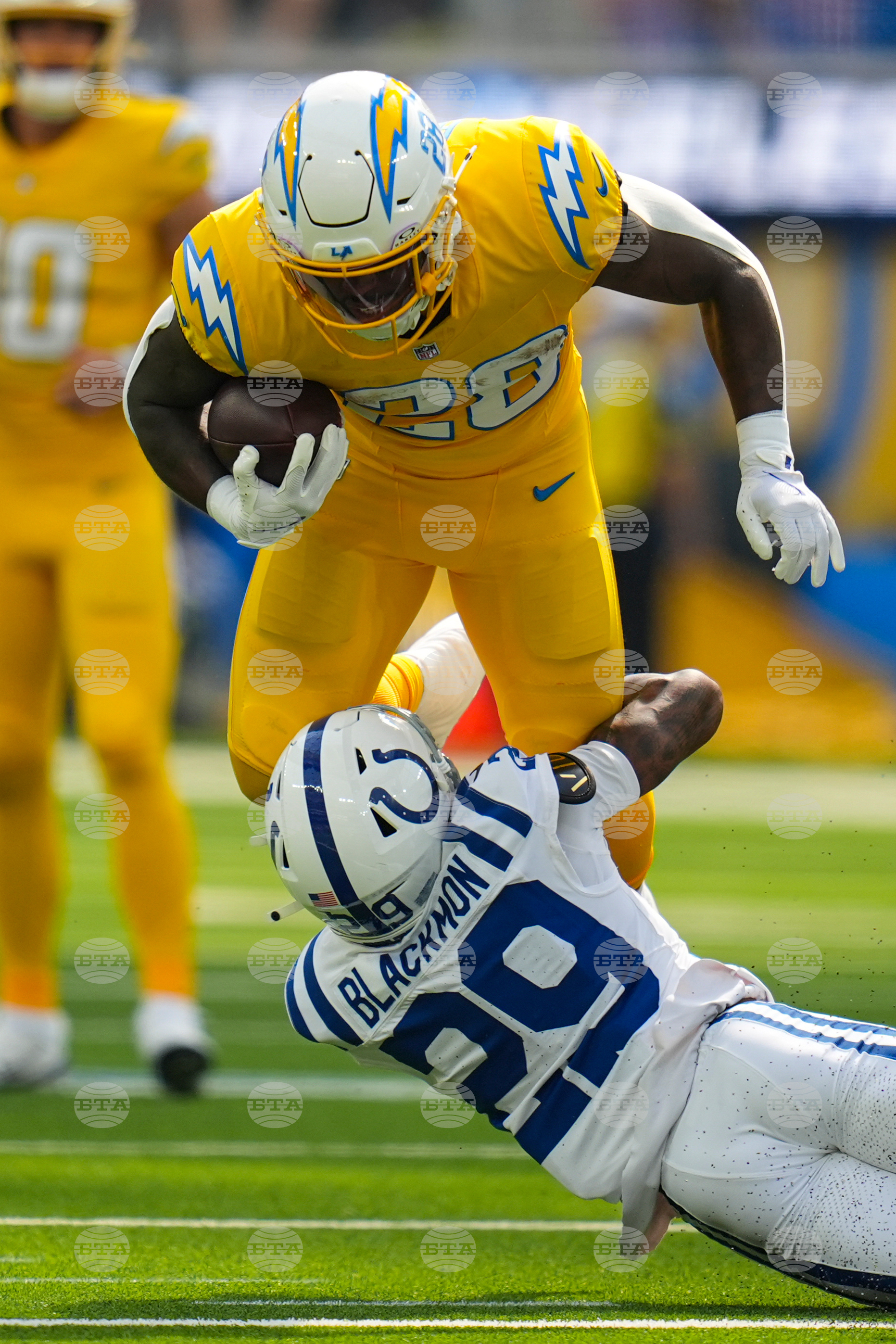 Indianapolis Colts cornerback Mekhi Blackmon (29) tackles Los Angeles Chargers running back Hassan Haskins (28) during the first half of an NFL football game Sunday, Oct. 19, 2025, in Inglewood, Calif. (AP Photo/Gregory Bull)
