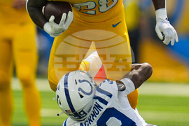 Indianapolis Colts running back Jonathan Taylor (28) dives past Los Angeles Chargers cornerback Benjamin St-Juste (24) during the first half of an NFL football game Sunday, Oct. 19, 2025, in Inglewood, Calif. (AP Photo/Carrie Giordano)