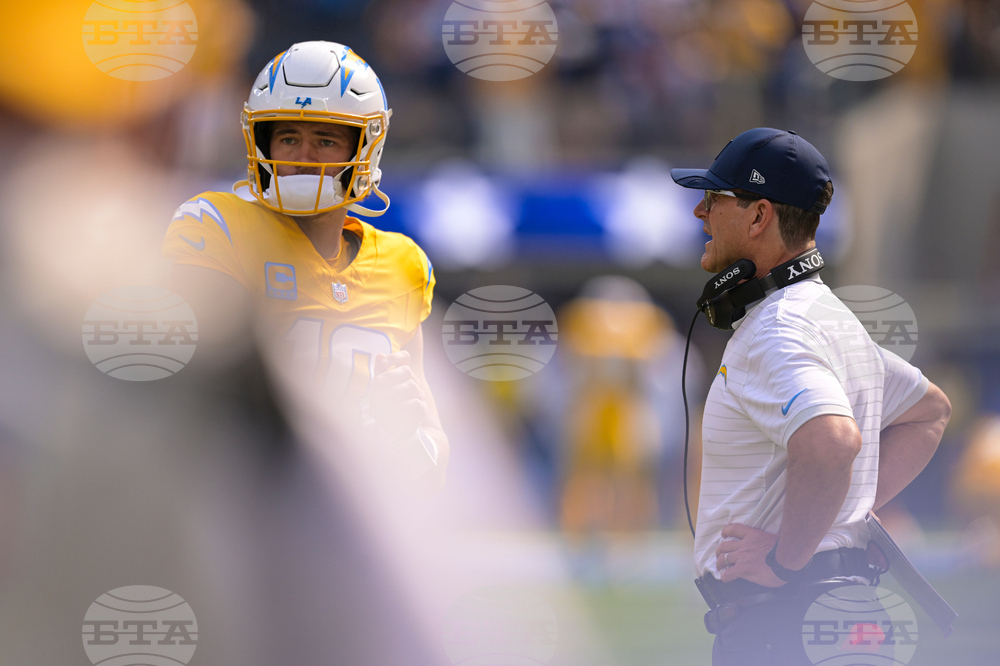 Los Angeles Chargers quarterback Justin Herbert (10) talks with head coach Jim Harbaugh during the first half of an NFL football game against the Indianapolis Colts Sunday, Oct. 19, 2025, in Inglewood, Calif. (AP Photo/Carrie Giordano)