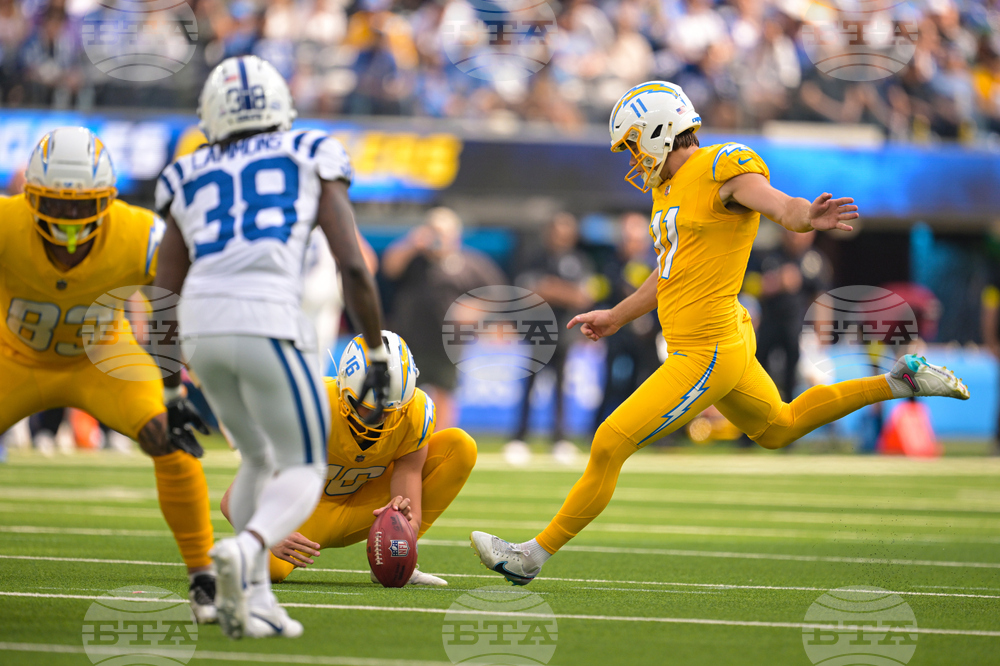 Los Angeles Chargers kicker Cameron Dicker (11) kicks a field goal against the Indianapolis Colts during the first half of an NFL football game Sunday, Oct. 19, 2025, in Inglewood, Calif. (AP Photo/Carrie Giordano)