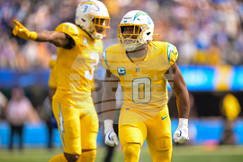 Los Angeles Chargers linebacker Daiyan Henley (0) celebrates after a tackle against the Indianapolis Colts during the first half of an NFL football game Sunday, Oct. 19, 2025, in Inglewood, Calif. (AP Photo/Carrie Giordano)