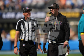 Indianapolis Colts head coach Shane Steichen talks with an official during the first half of an NFL football game against the Los Angeles Chargers Sunday, Oct. 19, 2025, in Inglewood, Calif. (AP Photo/Gregory Bull)