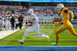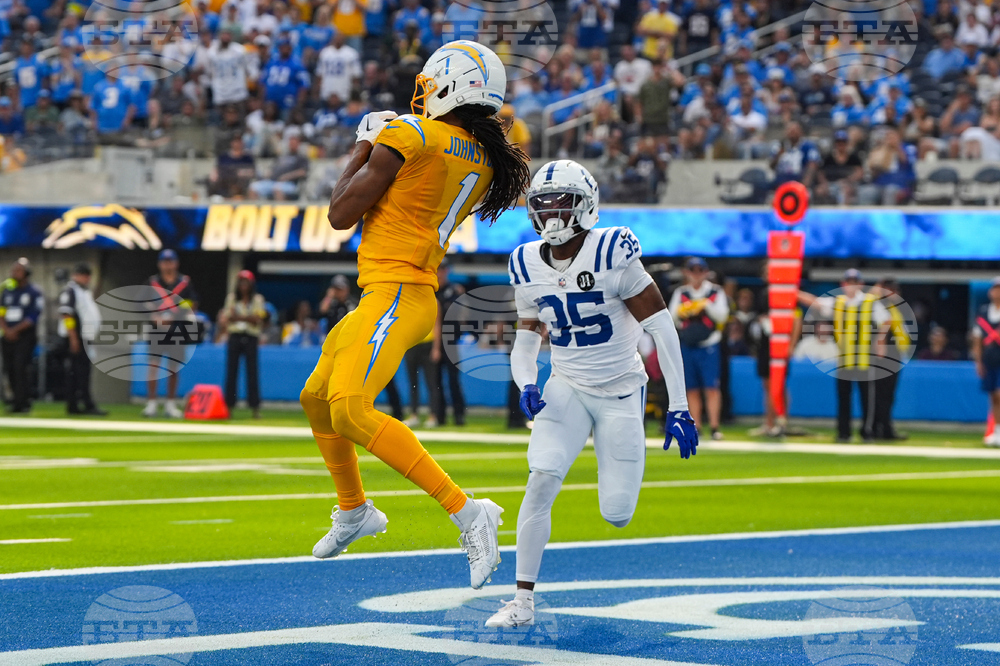 Los Angeles Chargers wide receiver Quentin Johnston (1) makes a catch for a touchdown in front of Indianapolis Colts cornerback Johnathan Edwards (35) during the second half of an NFL football game Sunday, Oct. 19, 2025, in Inglewood, Calif. (AP Photo/Gregory Bull)