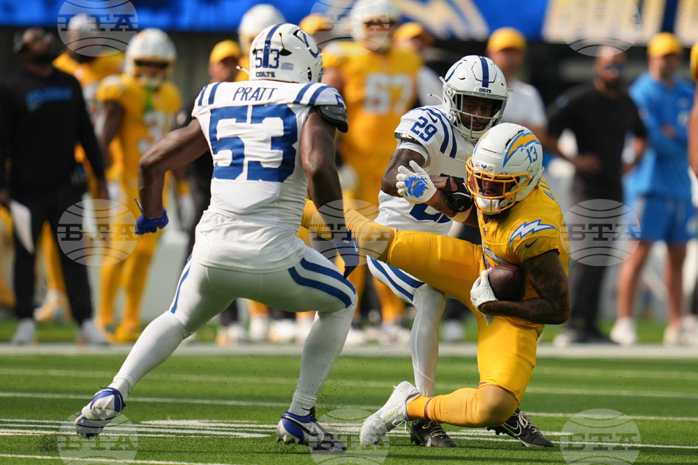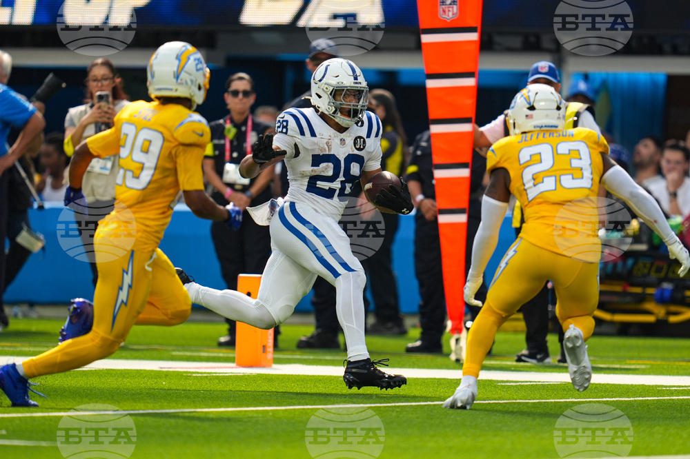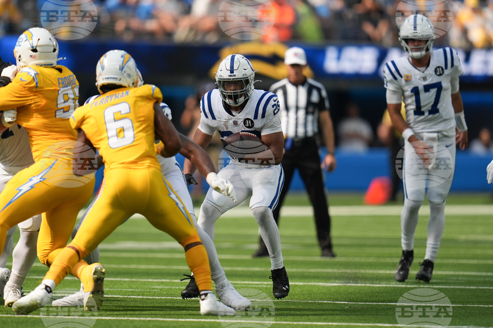Indianapolis Colts running back Jonathan Taylor (28) runs between Los Angeles Chargers cornerback Tarheeb Still (29) and safety Tony Jefferson (23) during the first half of an NFL football game Sunday, Oct. 19, 2025, in Inglewood, Calif. (AP Photo/Gregory Bull)