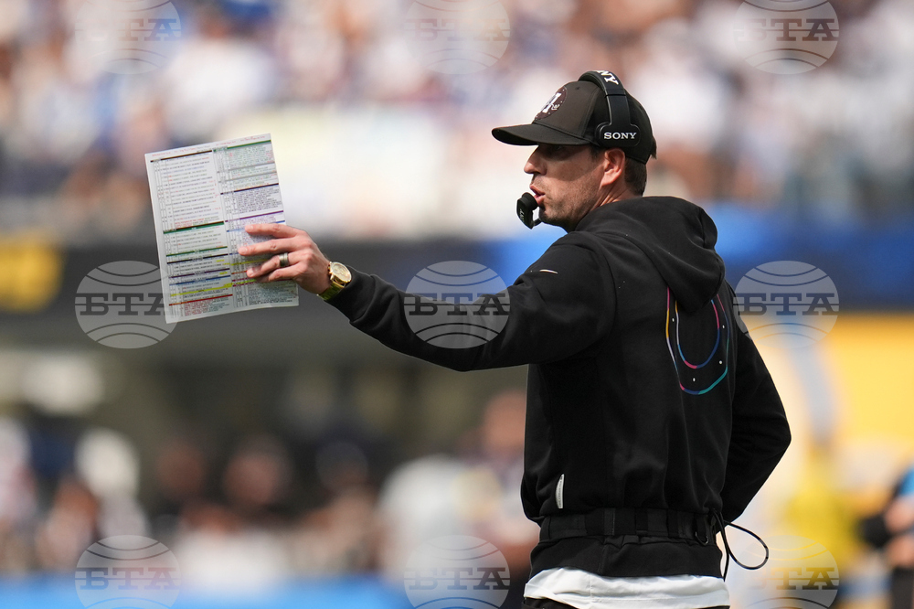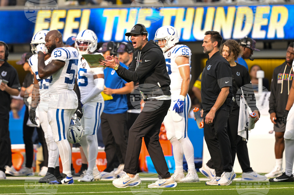 Indianapolis Colts head coach Shane Steichen on the sideline during the first half of an NFL football game against the Los Angeles Chargers Sunday, Oct. 19, 2025, in Inglewood, Calif. (AP Photo/Gregory Bull)