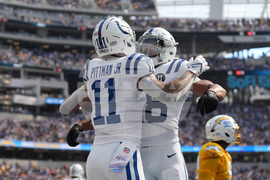 Indianapolis Colts wide receiver Michael Pittman Jr. (11) makes a catch for a two-point conversion against the Los Angeles Chargers during the second half of an NFL football game Sunday, Oct. 19, 2025, in Inglewood, Calif. (AP Photo/Carrie Giordano)