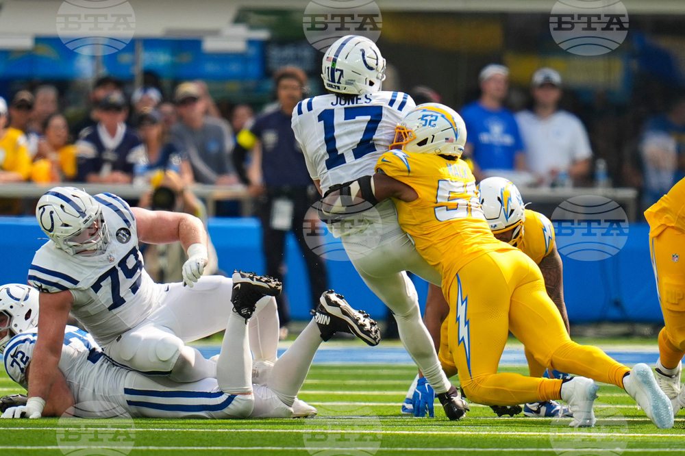 Indianapolis Colts quarterback Daniel Jones (17) is sacked by Los Angeles Chargers linebacker Khalil Mack (52) during the first half of an NFL football game Sunday, Oct. 19, 2025, in Inglewood, Calif. (AP Photo/Gregory Bull)