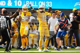 Los Angeles Chargers wide receiver Keenan Allen (13) signals after picking up a first down against the Indianapolis Colts during the first half of an NFL football game Sunday, Oct. 19, 2025, in Inglewood, Calif. (AP Photo/Gregory Bull)