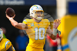 Los Angeles Chargers quarterback Justin Herbert (10) throws against the Indianapolis Colts during the second half of an NFL football game Sunday, Oct. 19, 2025, in Inglewood, Calif. (AP Photo/Gregory Bull)