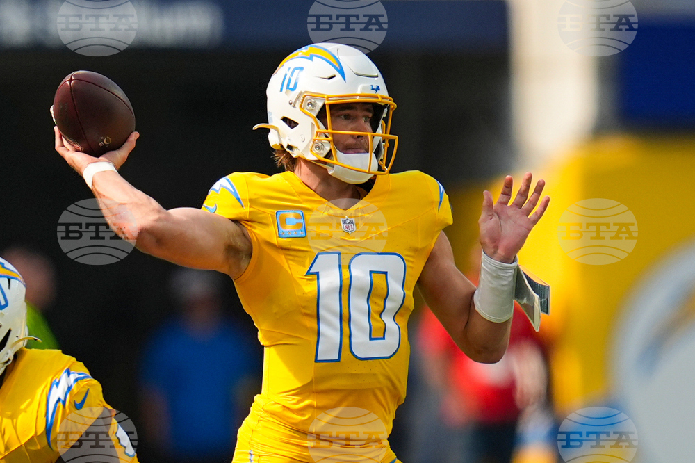 Los Angeles Chargers quarterback Justin Herbert (10) throws against the Indianapolis Colts during the first half of an NFL football game Sunday, Oct. 19, 2025, in Inglewood, Calif. (AP Photo/Gregory Bull)