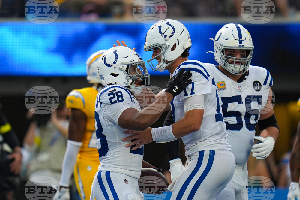 Indianapolis Colts running back Jonathan Taylor (28) celebrates a touchdown with quarterback Daniel Jones (17) against the Los Angeles Chargers during the second half of an NFL football game Sunday, Oct. 19, 2025, in Inglewood, Calif. (AP Photo/Gregory Bull)
