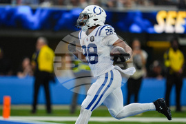 Indianapolis Colts running back Jonathan Taylor (28) breaks away for a touchdown against the Los Angeles Chargers during the second half of an NFL football game Sunday, Oct. 19, 2025, in Inglewood, Calif. (AP Photo/Gregory Bull)