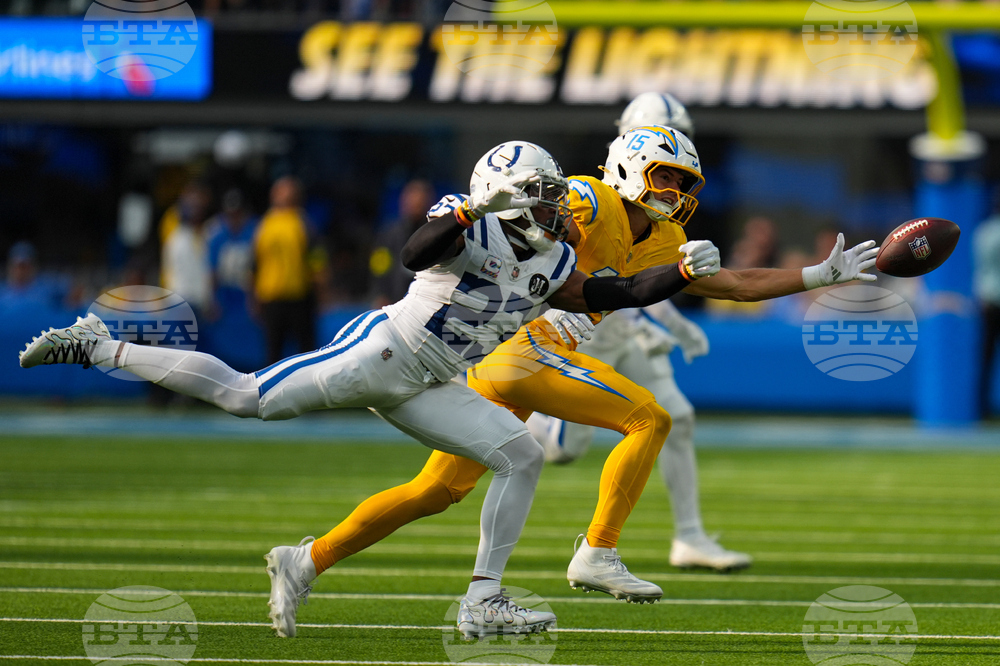 Indianapolis Colts safety Nick Cross (20) intercepts a pass in front of Los Angeles Chargers wide receiver Quentin Johnston (1) during the first half of an NFL football game Sunday, Oct. 19, 2025, in Inglewood, Calif. (AP Photo/Gregory Bull)