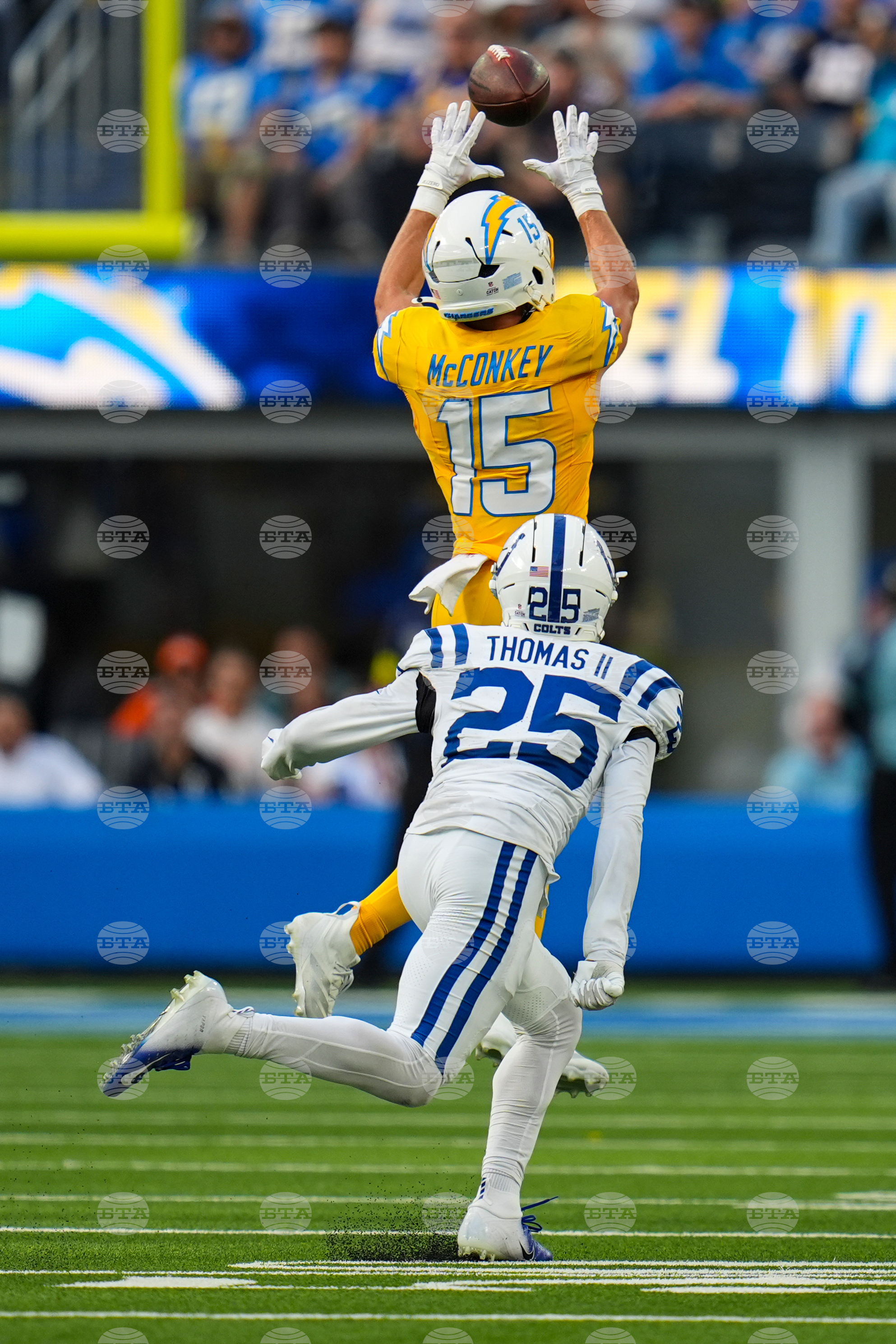 Los Angeles Chargers wide receiver Ladd McConkey (15) makes a catch over Indianapolis Colts safety Rodney Thomas II (25) during the second half of an NFL football game Sunday, Oct. 19, 2025, in Inglewood, Calif. (AP Photo/Gregory Bull)