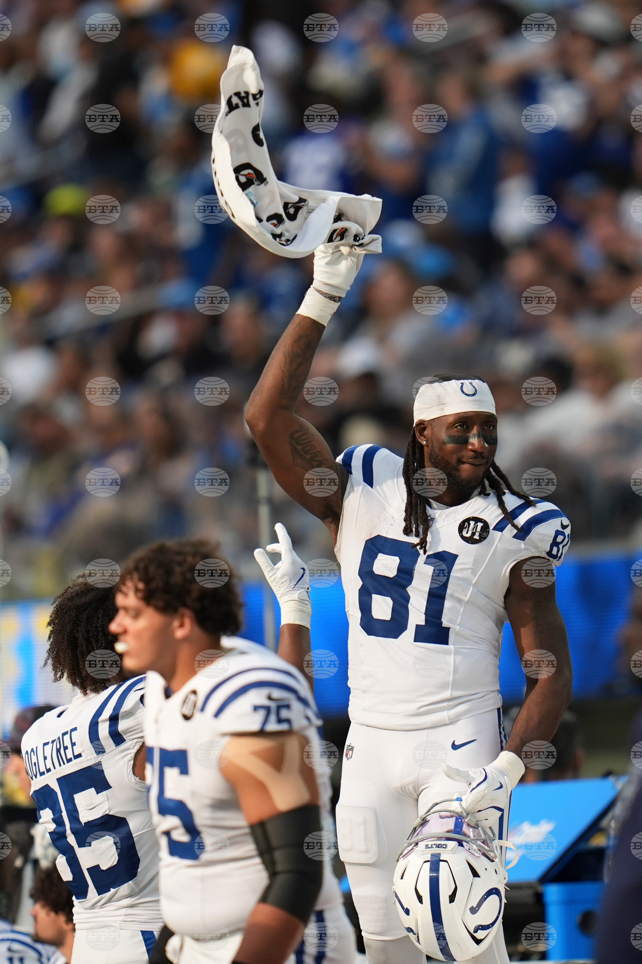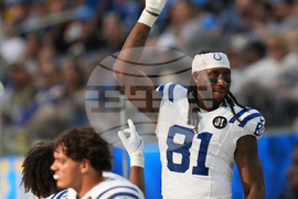 Indianapolis Colts tight end Mo Alie-Cox (81) celebrates on the bench during the second half of an NFL football game against the Los Angeles Chargers Sunday, Oct. 19, 2025, in Inglewood, Calif. (AP Photo/Gregory Bull)