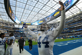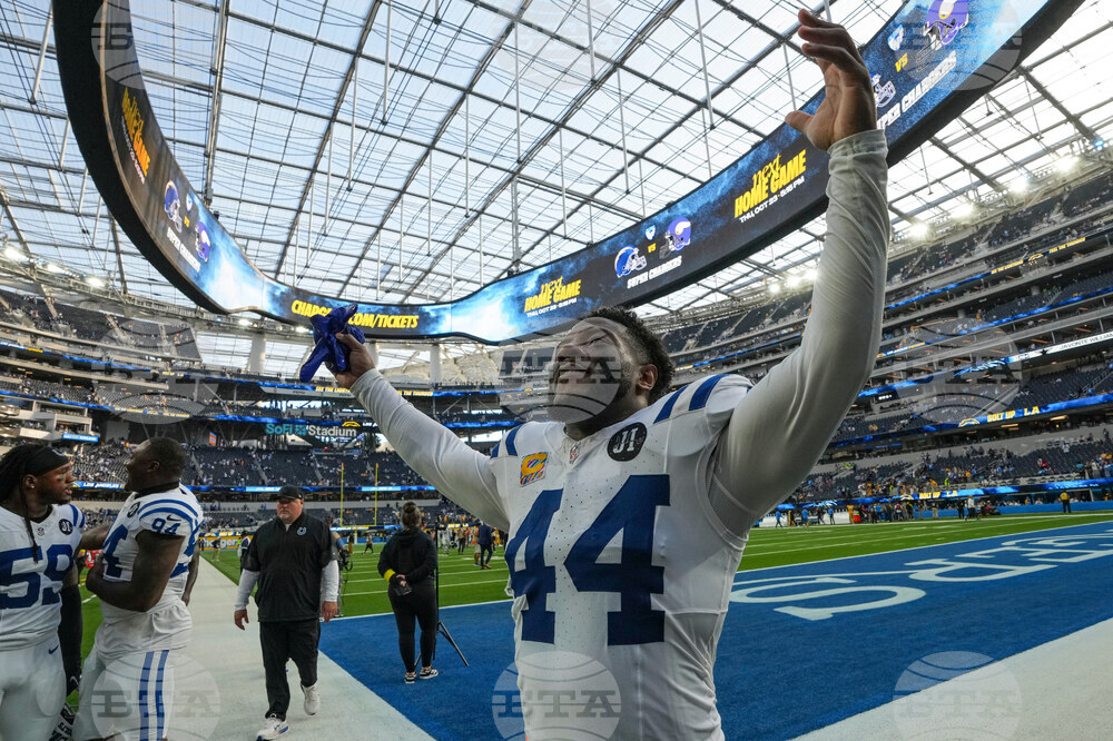 Indianapolis Colts outside linebacker Zaire Franklin (44) celebrates following an NFL football game against the Los Angeles Chargers Sunday, Oct. 19, 2025, in Inglewood, Calif. (AP Photo/Gregory Bull)