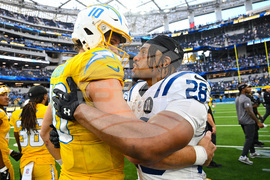 Los Angeles Chargers quarterback Justin Herbert (10) hugs Indianapolis Colts running back Jonathan Taylor (28) following an NFL football game Sunday, Oct. 19, 2025, in Inglewood, Calif. (AP Photo/Carrie Giordano)