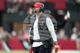 Arizona Cardinals head coach Jonathan Gannon reacts during the first half of an NFL football game against the Green Bay Packers Sunday, Oct. 19, 2025, in Glendale, Ariz. (AP Photo/Ross D. Franklin)
