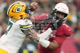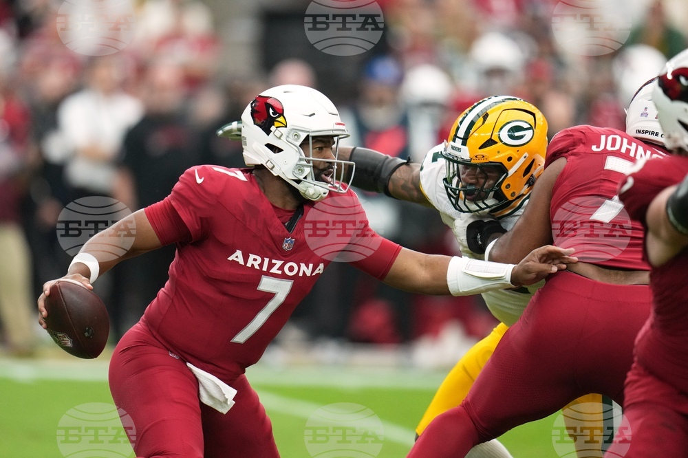 Arizona Cardinals' Jacoby Brissett is hit by Green Bay Packers' Quay Walker as he throws during the first half of an NFL football game Sunday, Oct. 19, 2025, in Glendale, Ariz. (AP Photo/Ross D. Franklin)