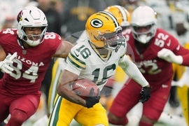 Green Bay Packers' Bo Melton returns a kickoff during the first half of an NFL football game against the Arizona Cardinals Sunday, Oct. 19, 2025, in Glendale, Ariz. (AP Photo/Ross D. Franklin)