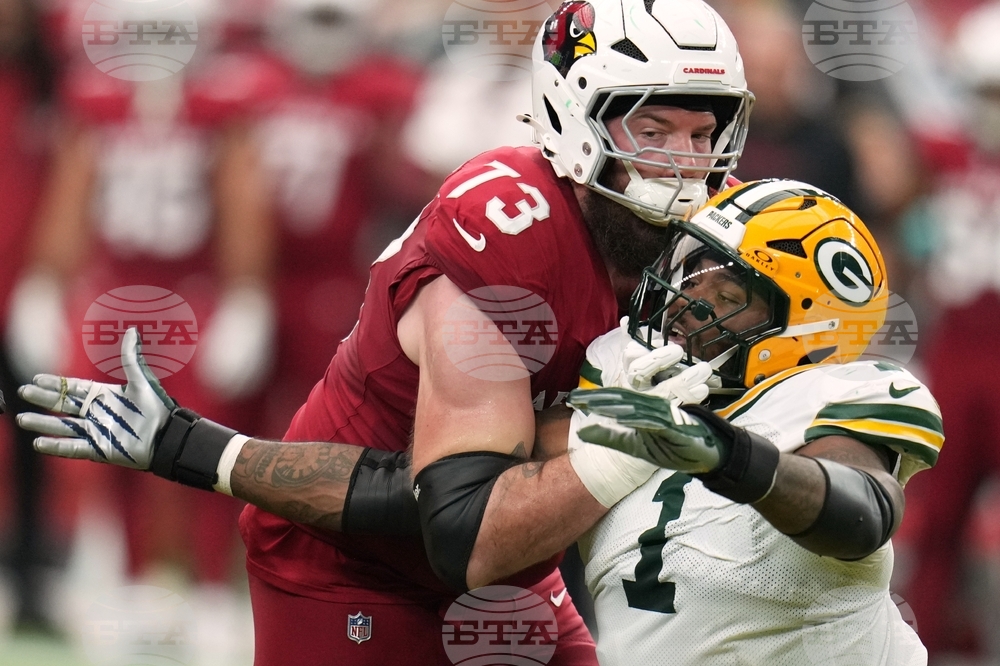 Green Bay Packers' Micah Parsons and Warren Brinson are called for a hip tackle penalty on Arizona Cardinals' Jacoby Brissett during the first half of an NFL football game Sunday, Oct. 19, 2025, in Glendale, Ariz. (AP Photo/Ross D. Franklin)