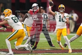 Green Bay Packers' Jordan Love throws during the first half of an NFL football game against the Arizona Cardinals Sunday, Oct. 19, 2025, in Glendale, Ariz. (AP Photo/Ross D. Franklin)