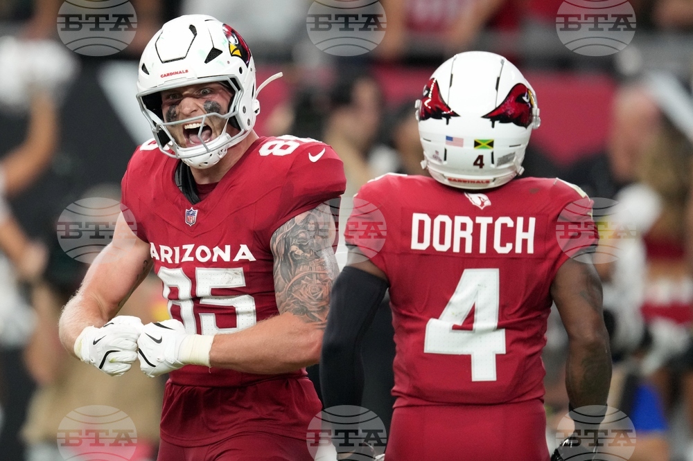 Arizona Cardinals' Trey McBride is introduced before an NFL football game against the Green Bay Packers Sunday, Oct. 19, 2025, in Glendale, Ariz. (AP Photo/Ross D. Franklin)