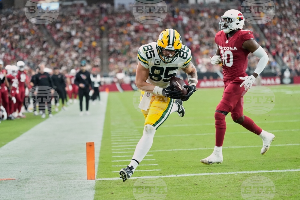 Green Bay Packers' Tucker Kraft catches a touchdown pass during the second half of an NFL football game against the Arizona Cardinals Sunday, Oct. 19, 2025, in Glendale, Ariz. (AP Photo/Ross D. Franklin)