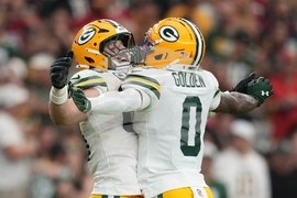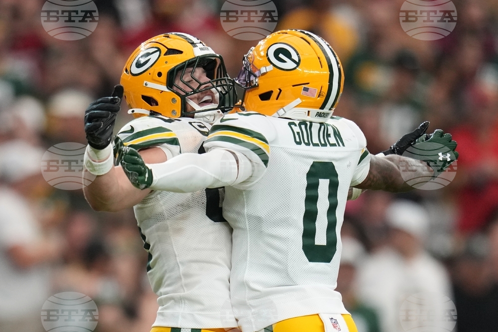 Green Bay Packers' Tucker Kraft celebrates his touchdown catch with Matthew Golden during the second half of an NFL football game against the Arizona Cardinals Sunday, Oct. 19, 2025, in Glendale, Ariz. (AP Photo/Rick Scuteri)