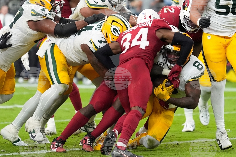 Green Bay Packers' Josh Jacobs tries to get past Arizona Cardinals' Akeem Davis-Gaither during the second half of an NFL football game Sunday, Oct. 19, 2025, in Glendale, Ariz. (AP Photo/Rick Scuteri)