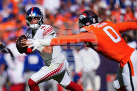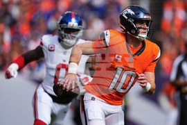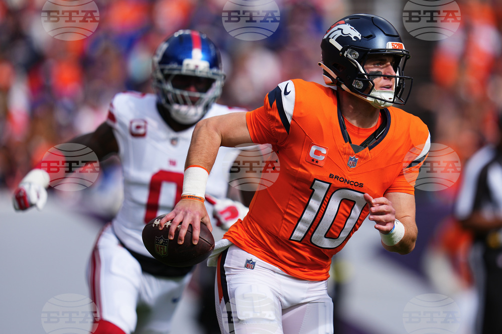 Denver Broncos quarterback Bo Nix (10) rolls out in front of New York Giants linebacker Brian Burns (0) during the first half of an NFL football game in Denver, Sunday, Oct. 19, 2025. (AP Photo/Jack Dempsey)