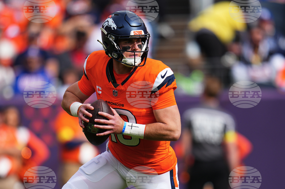 Denver Broncos quarterback Bo Nix (10) looks to pass during the first half of an NFL football game against the New York Giants in Denver, Sunday, Oct. 19, 2025. (AP Photo/Jack Dempsey)