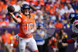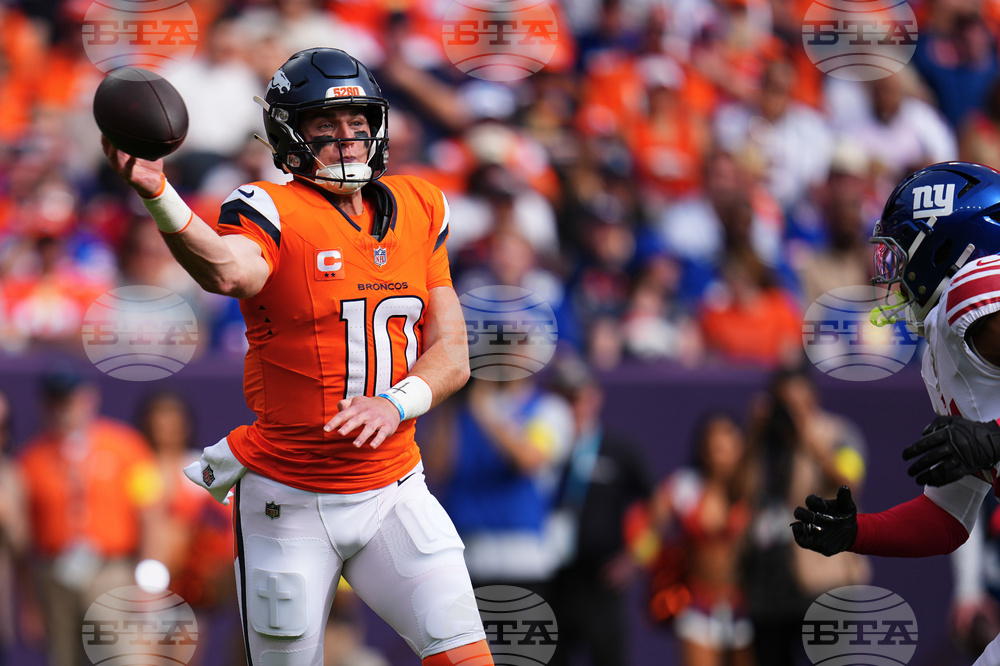 Denver Broncos quarterback Bo Nix (10) passes against the New York Giants during the first half of an NFL football game in Denver, Sunday, Oct. 19, 2025. (AP Photo/Jack Dempsey)
