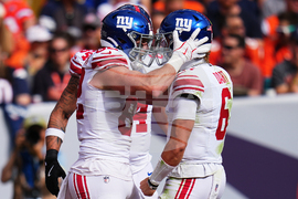 New York Giants tight end Daniel Bellinger (82) is congratulated by tight end Theo Johnson (84) after scoring against the Denver Broncos during the first half of an NFL football game in Denver, Sunday, Oct. 19, 2025. (AP Photo/Jack Dempsey)
