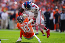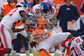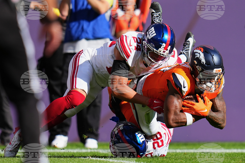 Denver Broncos wide receiver Courtland Sutton, middle, is tackled by New York Giants safety Dane Belton, top, and cornerback Cordale Flott (28) during the first half of an NFL football game in Denver, Sunday, Oct. 19, 2025. (AP Photo/Jack Dempsey)