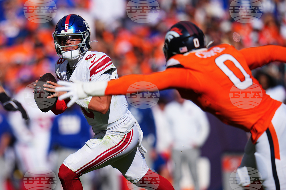New York Giants quarterback Jaxson Dart (6) looks to pass as Denver Broncos defensive end Zach Allen (99) applies pressure during the first half of an NFL football game in Denver, Sunday, Oct. 19, 2025. (AP Photo/David Zalubowski)