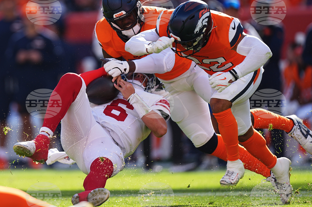 Denver Broncos quarterback Bo Nix (10) is sacked by New York Giants linebacker Brian Burns (0) during the first half of an NFL football game in Denver, Sunday, Oct. 19, 2025. (AP Photo/Jack Dempsey)