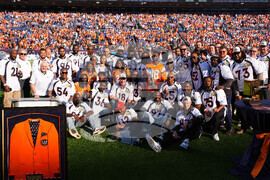 Players from the Denver Broncos' Super Bowl 50 championship team pose for photos during a ceremony unveiling the Broncos Ring of Fame plaque for former wide receiver Demaryius Thomas at halftime of an NFL football game between the Broncos and the New York Giants in Denver, Sunday, Oct. 19, 2025. (AP Photo/Jack Dempsey)