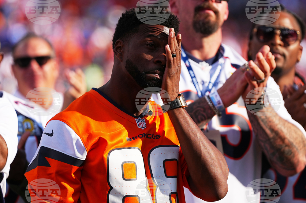 Former Denver Broncos wide receiver Emmanuel Sanders reacts during a ceremony unveiling the Broncos Ring of Fame plaque for former wide receiver Demaryius Thomas at halftime of an NFL football game between the Broncos and the New York Giants in Denver, Sunday, Oct. 19, 2025. (AP Photo/Jack Dempsey)