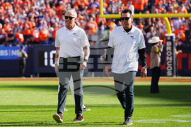 Hall of Famer John Elway, left, and former Denver Broncos head coach Gary Kubiak walk on the field during a ceremony unveiling the Broncos Ring of Fame plaque for former wide receiver Demaryius Thomas at halftime of an NFL football game between the Broncos and the New York Giants in Denver, Sunday, Oct. 19, 2025. (AP Photo/Jack Dempsey)
