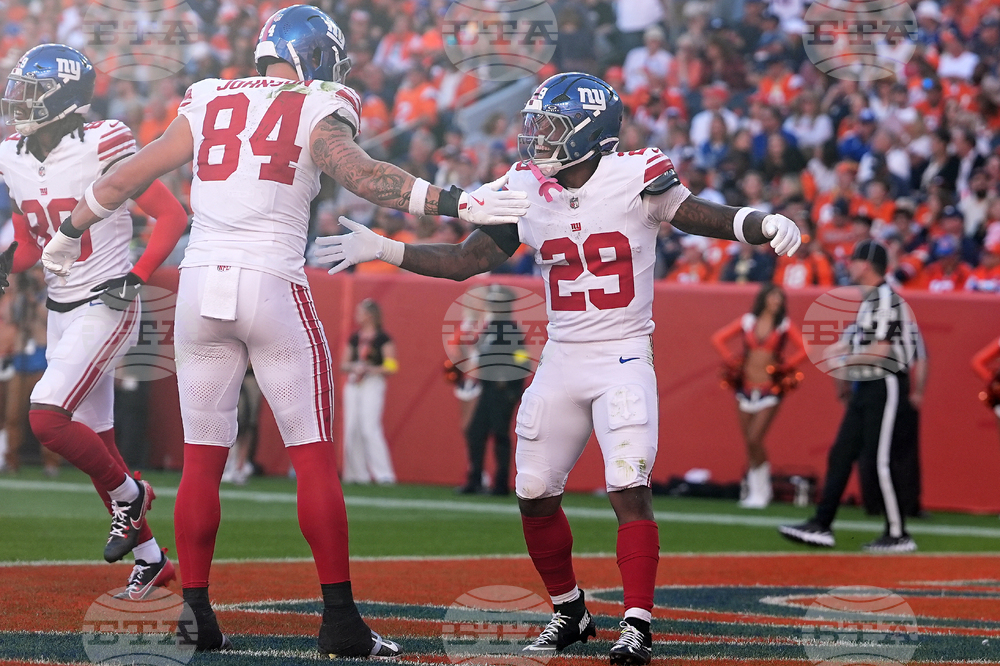 New York Giants safety Dane Belton (24) and safety Tyler Nubin (27) react after a defensive stop against the Denver Broncos during the first half of an NFL football game in Denver, Sunday, Oct. 19, 2025. (AP Photo/David Zalubowski)