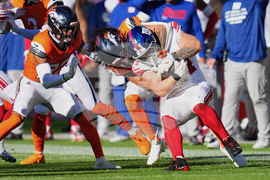 New York Giants running back Cam Skattebo, right, is tackled by Denver Broncos safety Talanoa Hufanga during the second half of an NFL football game in Denver, Sunday, Oct. 19, 2025. (AP Photo/Jack Dempsey)
